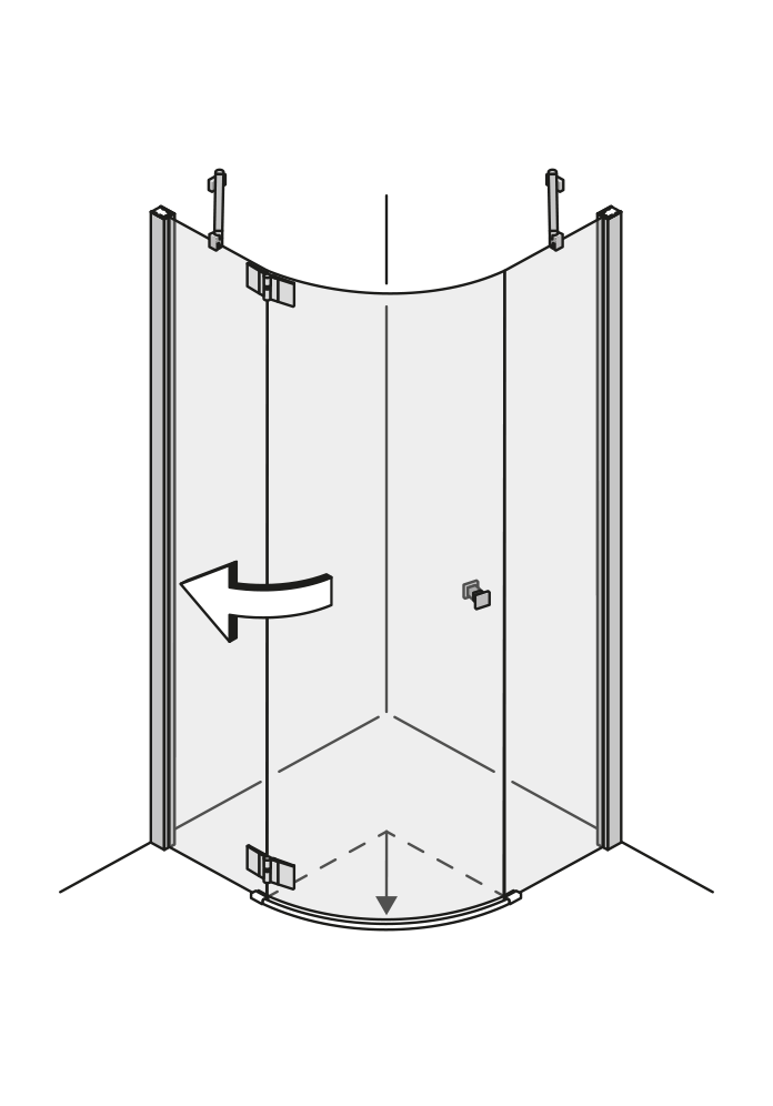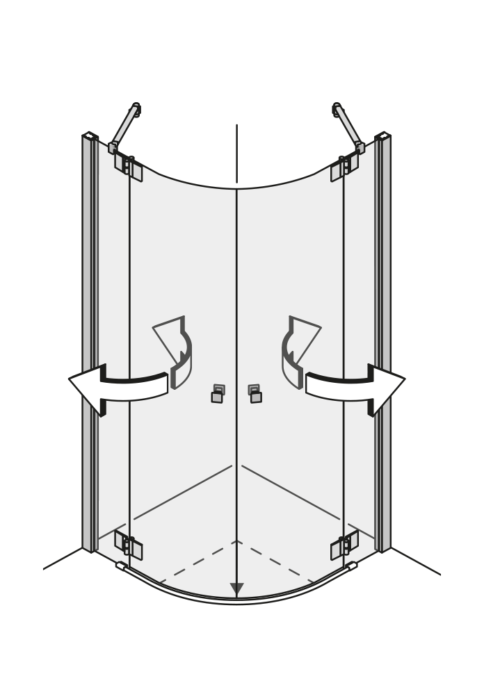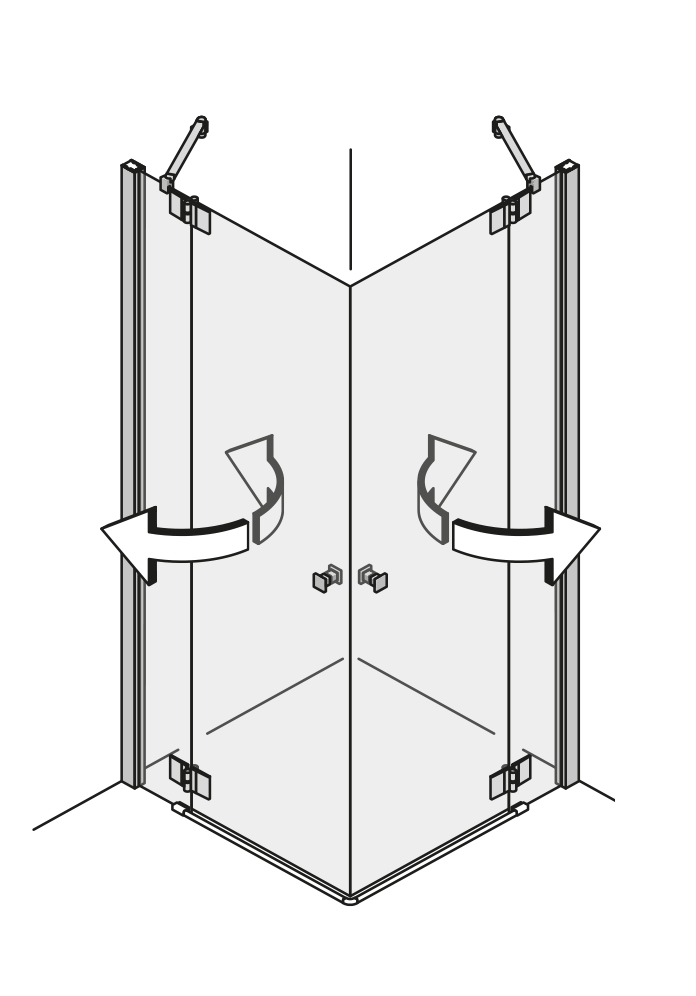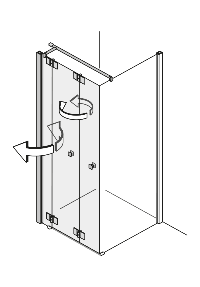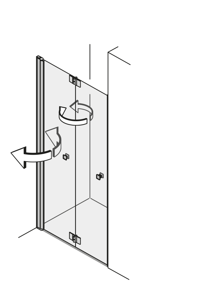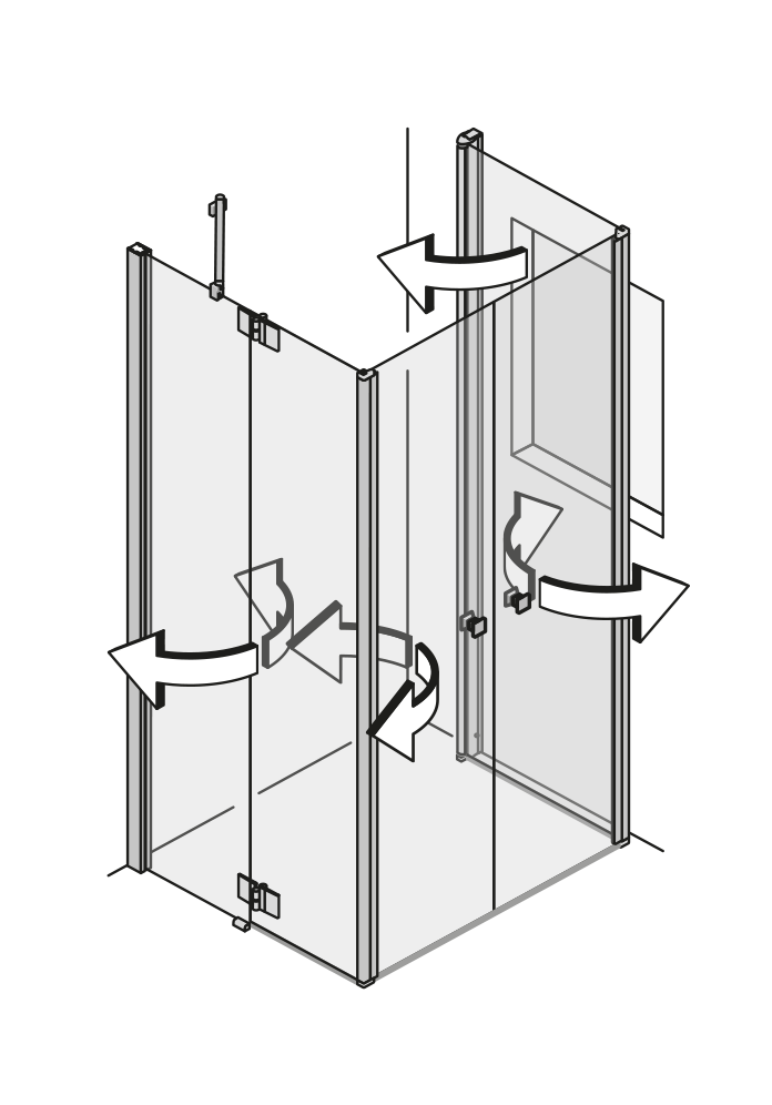 Durch die 360 ° Scharniere lässt sich jede Türfläche nach innen und außen falten – ideal für kleine Bäder oder schmale Nischen. Das einzigartige 360 ° TWIN-Scharnier bringt freien Raum in jedes Bad. Nach dem Duschen lassen sich die Wände einfach wegfalten.