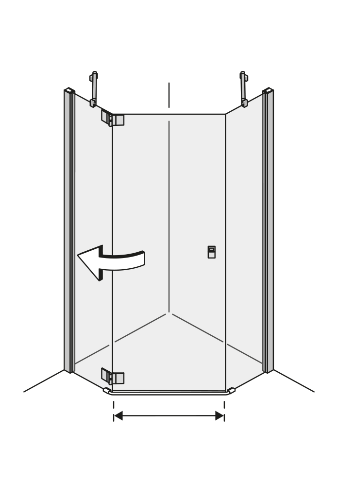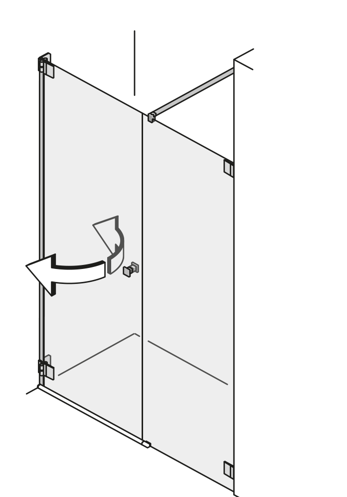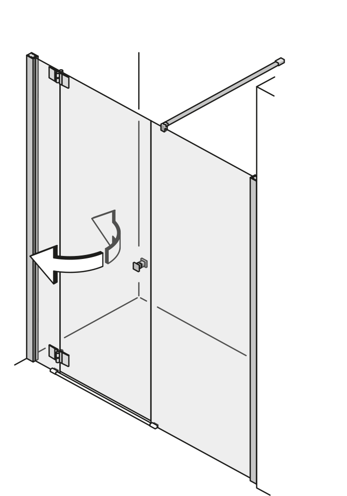 Pendeltür an Fixteil zu zwei Seitenwänden